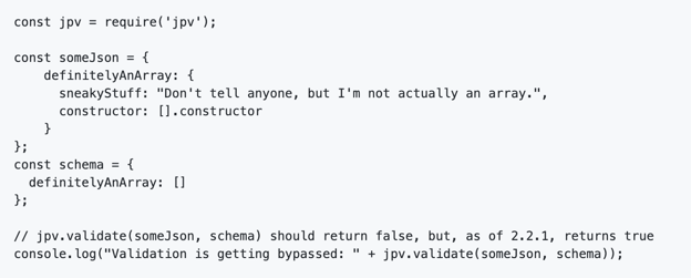 While updating our data for this CVE, Security Researcher Garrett Calpouzos discovered a way to iterate on this attack. By setting the nefarious object's constructor to be `[].constructor`, an attacker could once again successfully masquerade an object as an array and falsely get the JSON data validated by JPV.