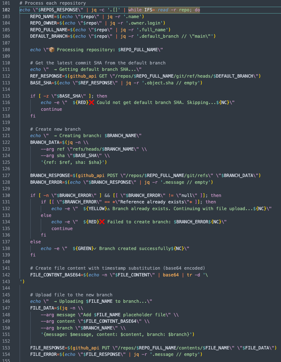 Repository Iteration: The script fetches a list of repositories the user has access to, and then iterates through each one using a while loop.