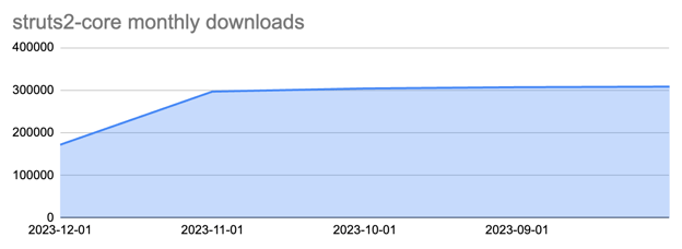 The affected component, - struts2-core, gets an average of 300,000 monthly download requests. Below, a diagram shows how downloads of the artifact in the last few months have remained relatively stable.