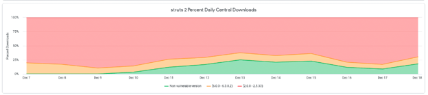 This type of vulnerability is interesting to look at because it is very representative of a serious security vulnerability that isn't gaining nearly as much media attention as some other vulnerabilities of this magnitude. At the time of writing, about 80% of all downloads of struts2-core are still vulnerable to the issue.