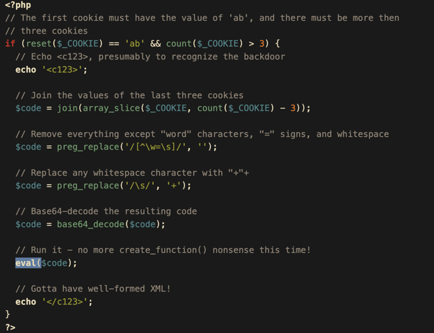 Bowes, who was able to successfully deobfuscate the PHP code explains in his blog post that the code reads values from 4 cookies, before running an "eval()" function to run suspicious code. He further shares a Metasploit exploit by another researcher ('h00die-gr3y') targeting the particular backdoor in Ivanti products: