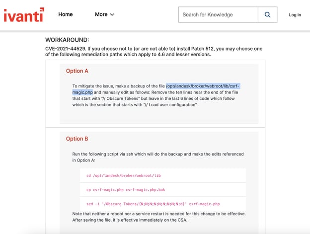 Ivanti users had the choice of either applying a "patch 512" issued by the vendor, or manually editing a "csrf-magic.php" file in the product, and removing the last few lines of code present in it, starting with "// Obscure Tokens."