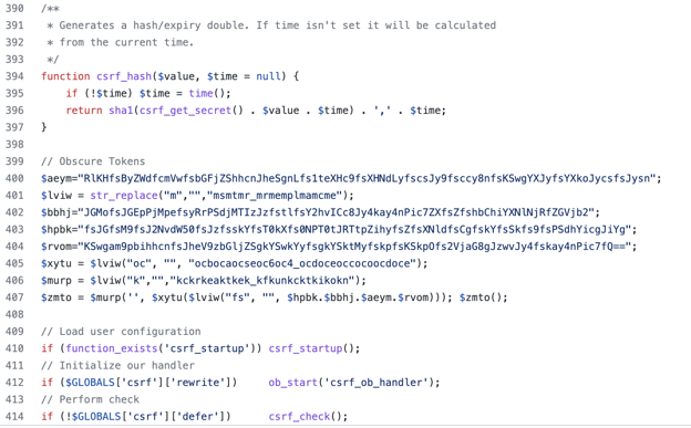 Notice the malicious backdoor present from lines 399 to 407, packed between the legitimate blocks of code: the "csrf_hash()" function and another which loads the user configuration. The legitimate blocks are part of the real csrf-magic package, but the "obscure tokens" code pops out of nowhere.