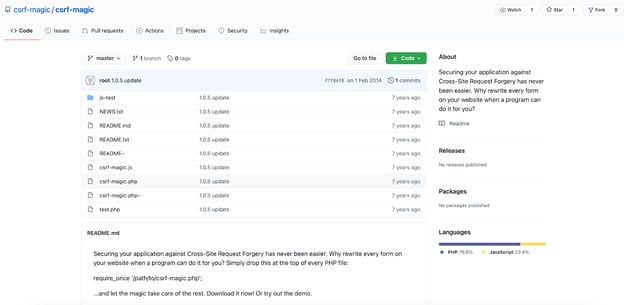 Note, the official Git repos for the project are different than the one shared by Nguyen at the time - hxxps://github(.)com/csrf-magic/csrf-magic… which no longer exists on GitHub. Archived copies of the latter, however, retain some pages and help us better understand what could have happened.